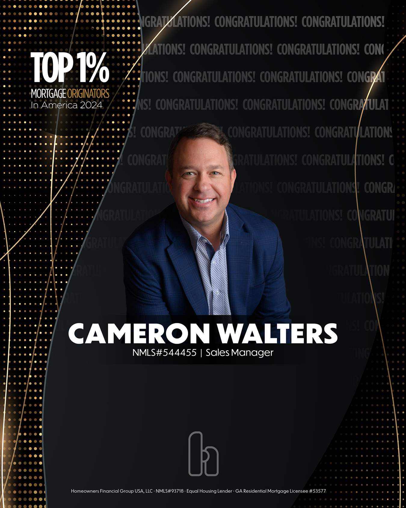 Cameron Walters NMLS#544455 has been helping families finance their dream homes for twenty years. As a Sales Manager at Homeowners Financial Group, he guides his clients along their homeownership journey from start to finish. Cameron’s extensive knowledge of mortgage products offered on the market today is a tremendous asset in building lasting relationships with business partners and homebuyers. These relationships make the home loan process as smooth and comfortable as possible. Whether purchasing a new home or refinancing your current home, you can expect frequent and transparent communication every step of the way from Cameron and his team.