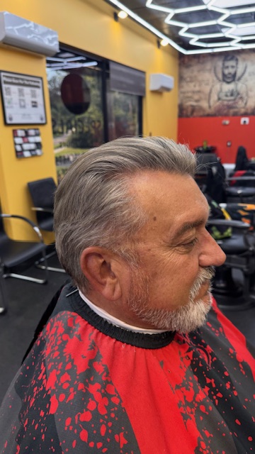 Gentlemen’s Haircut & styling with either shears or clippers. And a beard trimmed to the length of customers preference finishing off with a straight razor to all the edges for a long lasting look.