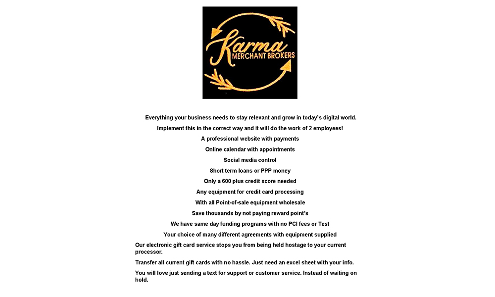 Alabama Arkansas Florida Georgia Missouri Mississippi New Hampshire Ohio Indiana Iowa Pennsylvania………. Say Goodbye to Merchant Service Headaches Are you tired of high processing fees, poor customer support, and a lack of transparency from your merchant service provider? It’s time to switch to the Daddy-Daughter Duo. Our company is dedicated to providing the best possible solution for businesses like yours. With access to the latest technology, a commitment to customer support, and transparent pricing, we’ll help you say goodbye to the headaches of the traditional merchant service industry. Our company addresses the key complaints that businesses have about the merchant services industry, including high processing fees, slow payment processing times, security concerns, and outdated technology. We’ll help you get the payment processing solution that you need to grow your business. Don’t let the traditional merchant service industry hold you back any longer. The Daddy-Daughter Duo is here to provide you with the payment processing solution that you need to succeed. Contact us today to learn more. We even made our long web address simpler to get to now. Just type karmakd.com or Call 888-722-5914 ext. 1