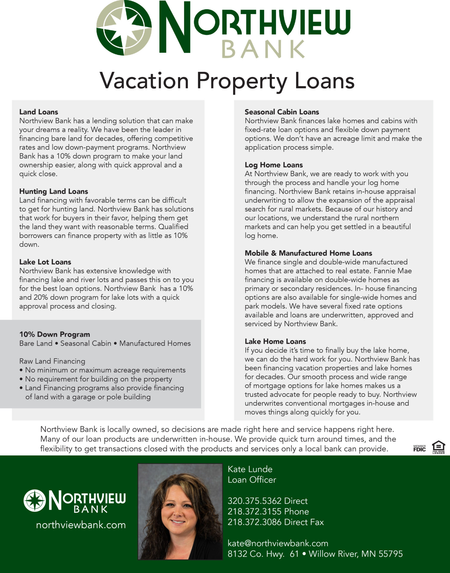 Kate Lunde is the Loan Officer in the Willow River branch of Northview Bank. Kate has been in banking for more than 10 years. She has experience in multiple financial products, with the last two years being spent working extensively in mortgage lending. The most common type of lending Kate provides is vacation property loans, bare land loans, and seasonal cabin loans.